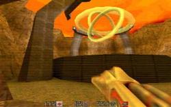 Im Außengebiet siehst du drei Ringe auf einer Plattform, die sich bewegen. Springe mit Hilfe des Rocket-Jump auf die Plattform ...