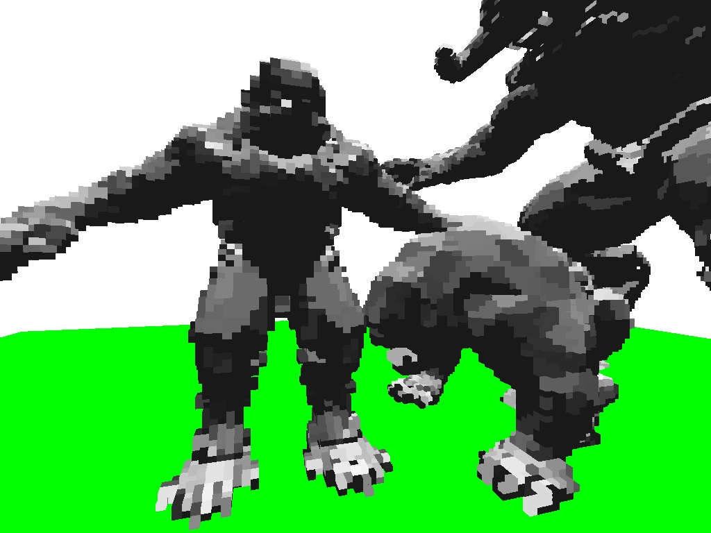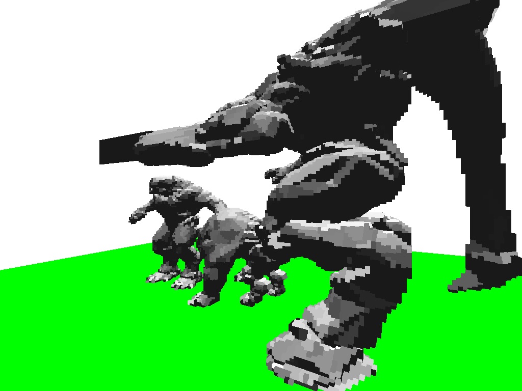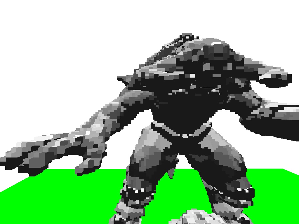 Tool Nummer 1 hat die Szene per Raycasting Dreieck für Dreieck analysiert, für jeden Treffer einen Farbwert berechnet (aka Shading) und den Punkt anschließend einem 512X512X512 Array zugewiesen (ja einfach Typecast auf int für die Position).